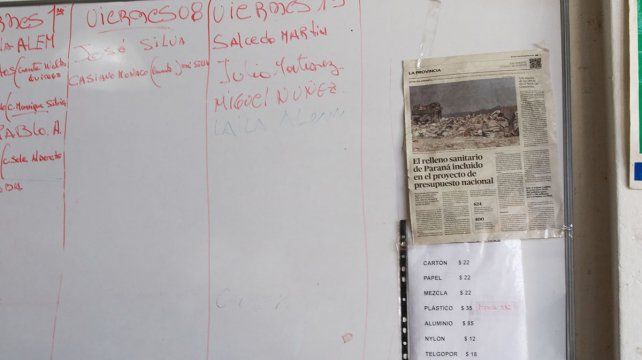 Cada día a las 7 empieza el desfile de los 200 cartoneros que integran la cooperativa Recicladores del Paraná en el galpón de calle Sebastián Vázquez 333. El que llega busca un carro y un bolsón y sale a recorrer la ciudad, en un circuito que él mismo se organiza. Todo el material reciclable que recolecta lo trae, se lo pesa y se le anota el valor. El cartón lo vende a 22 pesos el kilo, igual que el papel. El plástico es más valioso, 35 pesos los mil gramos, y más difícil de conseguir. No tanto como el aluminio, que cotiza 85 pesos. El nylon a 12 y el telgopor a 18 completan la lista de precios exhibida en una hoja, dentro de un folio, pegada en la pared a la entrada del local.