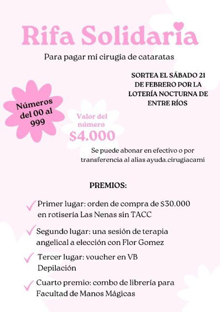 La rifa solidaria incluye premios donados por emprendedores locales y se sorteará el 21 de febrero mediante la Lotería Nocturna de Entre Ríos. Cada número tiene un valor de 4.000 pesos y se pueden adquirir a través de sus redes sociales (@soycamigomez) o por contacto directo al 3435093240.