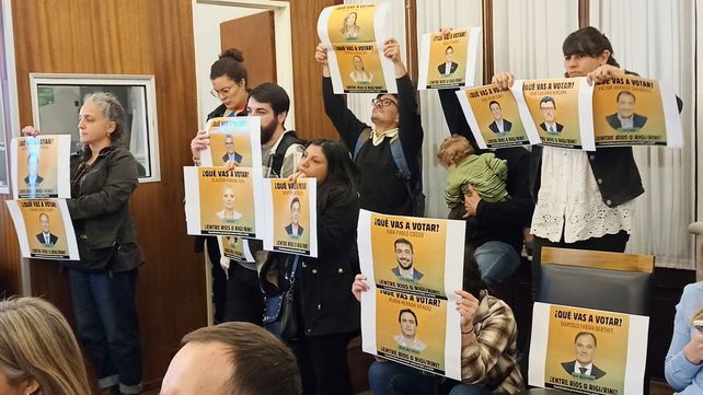 Acudieron con carteles en los que estaba el rostro de cada senador/a y la pregunta “¿Qué vas a votar? Entre Ríos o RIGI/RINI”.