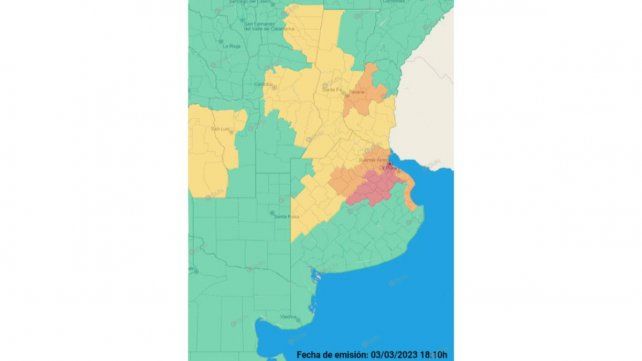 También se encuentran en alerta naranja varios partidos de la provincia de Buenos Aires, mientras que en nivel rojo se encuentra la Ciudad Autónoma de Buenos Aires, oeste del conurbano y centro de esa provincia.