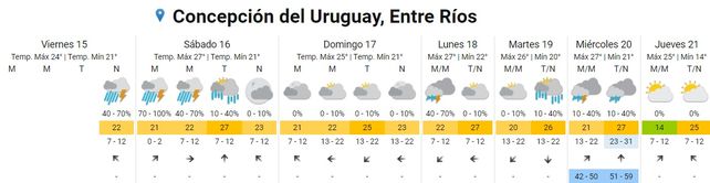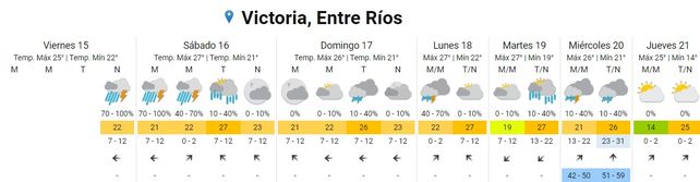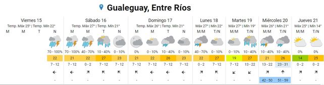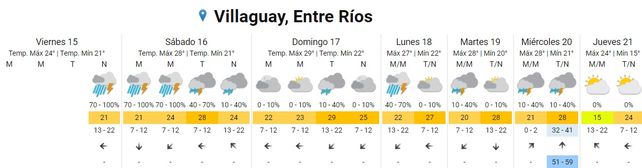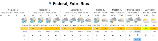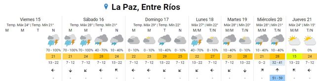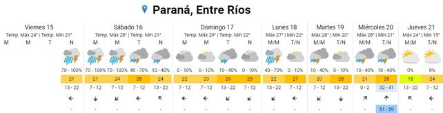 Se esperan, para este sábado, tormentas fuertes por la mañana del sábado y aisladas por la tarde y noche. Las temperaturas promedio se ubicarán entre los 21 grados, la mínima, y 28, la máxima. El viento soplará desde el sector norte, rotando al noreste, luego al este y al sudeste.
