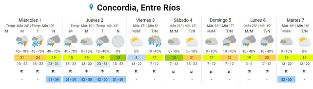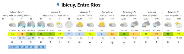 Para el lunes se esperan tormentas aisladas durante toda la jornada con temperaturas entre los 18 y los 22 grados y vientos soplando del sudoeste rotando al sur.