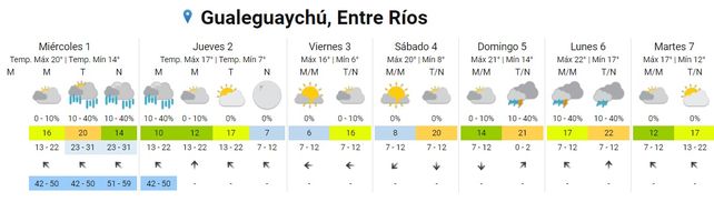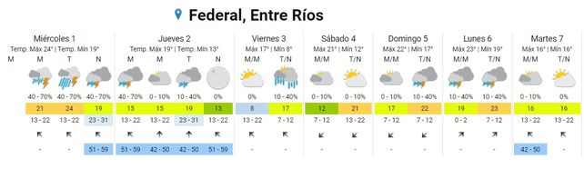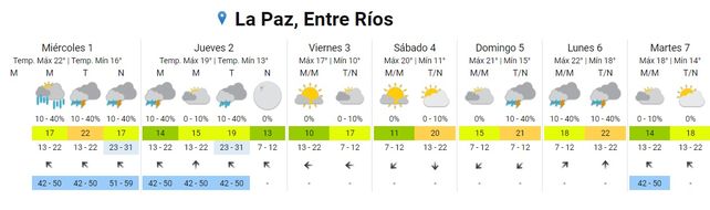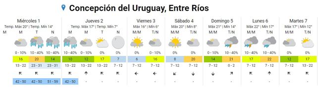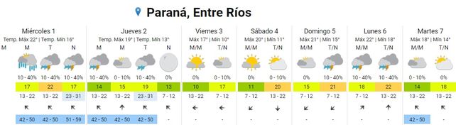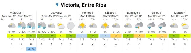 Para el jueves se esperan tormentas aisladas por la madrugada, una mañana con cielo mayormente nublado, lluvias aisladas por la tarde y cielo despejado por la noche. Los vientos rotarán desde el sudeste al sur y al sudeste nuevamente. Las temperaturas experimentarán un leve descenso y se ubicarán entre los 13 y los 19 grados.