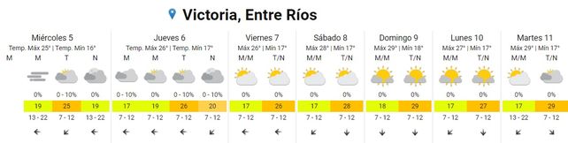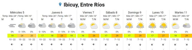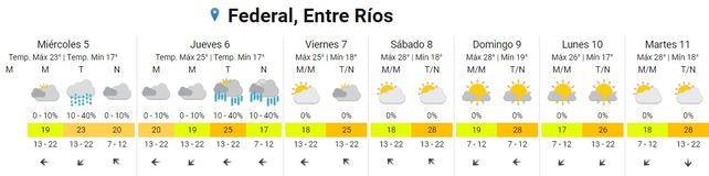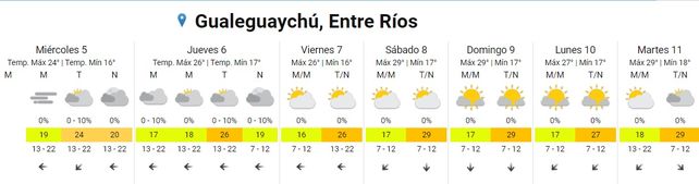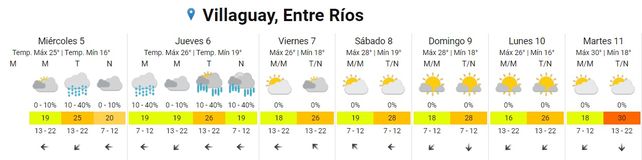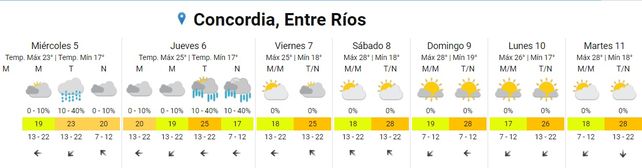 Para Concordia, el pronóstico prevé 17 grados de mínima y 23 de máxima, también con probabilidad de lluvias para la tarde de este miércoles. En tanto, para Gualeguaychú, luego de una mañana en la que se prevé presencia de neblina, la mínima será de 16 y la máxima de 24 grados.
