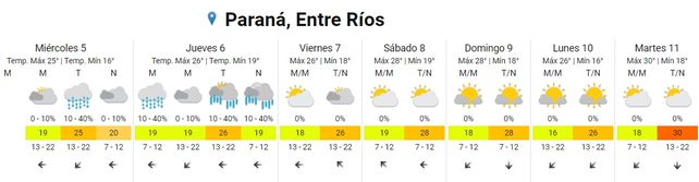 De acuerdo al pronóstico, durante la tarde de este miércoles hay probabilidades de chaparrones en Paraná y la zona, con una temperatura mínima que estará en torno a los 18 grados y una máxima que ascenderá hasta los 25 grados.