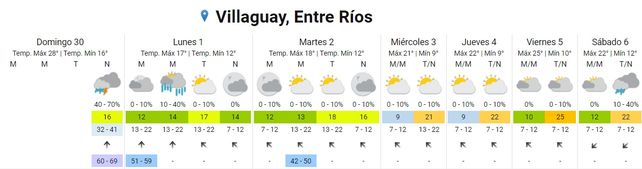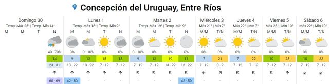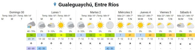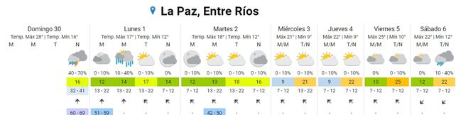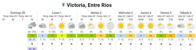 Para el sábado se espera una temperatura mínima de 12 y una máxima de 22. El cielo estará mayormente nublado durante la mañana y se pronostican lluvias aisladas para la tarde y la noche. Los vientos soplarán del norte.