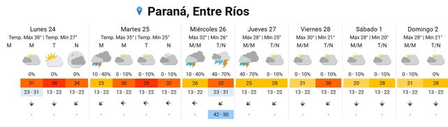 Los departamentos Paraná, La Paz, Villaguay, Nogoyá y Diamante permanecen en alerta rojo por altas temperaturas en el informe del Servicio Meteorológico Nacional (SMN). El organismo pronosticó lluvias y tormentas a partir del miércoles para la provincia.