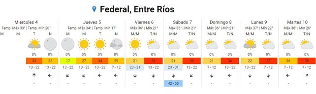 El Servicio Meteorológico Nacional (SMN) prevé para los próximos días un paulatino aumento de las temperaturas promedio, tiempo bueno y sin precipitaciones. Si bien se pronosticó una ola de calor para algunas provincias argentinas y centro del país, el fenómeno no afectará a la provincia de Entre Ríos que se mantiene en verde en el mapa del organismo meteorológico.