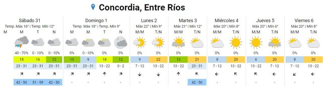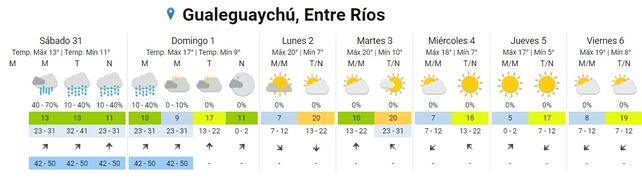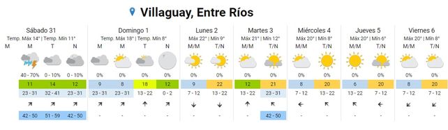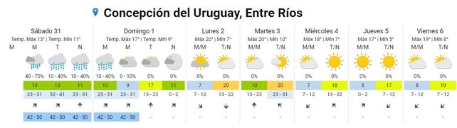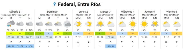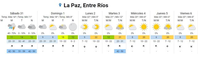 Este sábado precipitan lluvias en la región con tormentas por la madrugada y mañana. El cielo estará nublado por la tarde y mayormente nublado por la noche. Las temperaturas se ubicarán entre los 11 y los 14 grados y los vientos soplarán del sudoeste durante toda la jornada en el orden de los 42 a los 59 kilómetros por hora.
