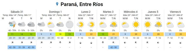 Para el jueves, el cielo permanecerá despejado durante la mañana y algo nublado durante la tarde. Las temperaturas serán del orden de los 6 a los 20 grados y los vientos soplarán en sudeste rotando al este.