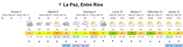 Finalmente el viernes habrá cielo parcialmente nublado durante toda la jornada, temperaturas entre 19 y 26 grados y los vientos soplarán del Norte rotando al sudoeste.