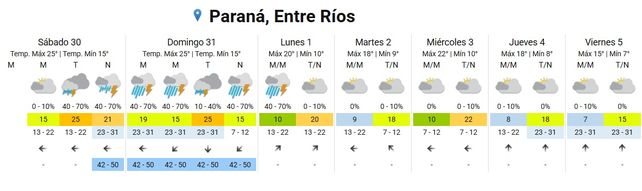 Para este domingo se esperan tormentas fuertes durante la madrugada y durante la mañana. Por la tarde se pronosticaron tormentas aisladas que se intensificarán durante la noche. Las temperaturas se ubican entre los 15 y los 25 grados y los vientos soplarán del este rotando al noreste y luego al norte en el orden de los 42 a 50 kilómetros la hora.