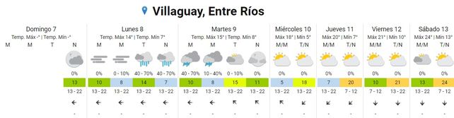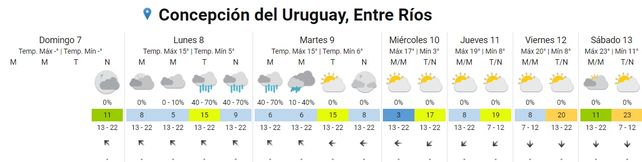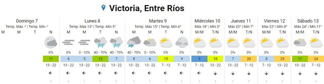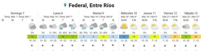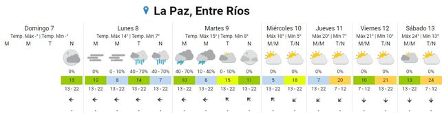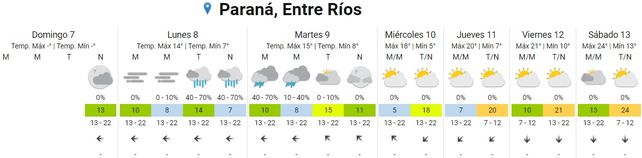 El Servicio Meteorológico Nacional (SMN) prevé un paulatino ascenso de temperaturas promedio a partir del jueves. El lunes inicia la semana laboral con neblinas matinales y temperaturas de entre 7 y 14 grados centígrados. Por la tarde y noche se esperan lluvias. La dirección predominante del viento será del este.