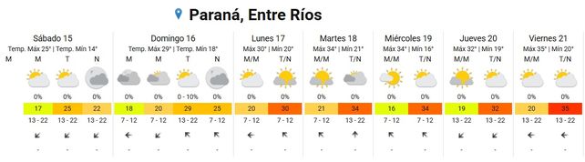 Para el martes, el cielo estará algo nublado por la mañana, mayormente nublado por la tarde y por la noche. Las temperaturas treparán a 21 grados de mínima y 34 de máxima . Los vientos soplarán del sector sudeste rotando al sur.