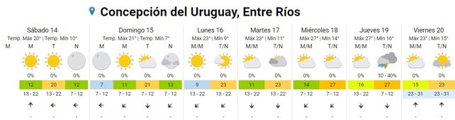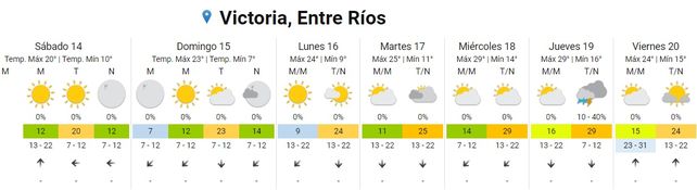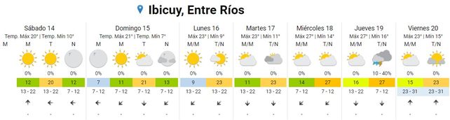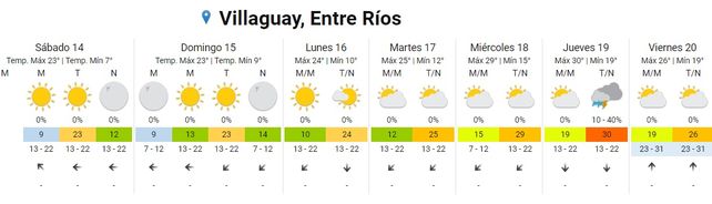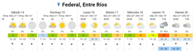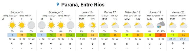 Para el domingo el cielo se presentará despejado durante toda la jornada, las temperaturas promedio estarán en el orden de los 9 y los 23 grados y los vientos predominarán del sector este rotando al noreste.