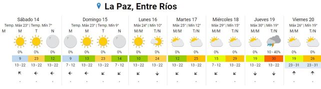 Para este sábado cielo despejado durante toda la jornada. Las temperaturas promedio se ubicarán entre los 7 grados de mínima, y los 23 grados de máxima. Los vientos soplarán del sudeste rotando al este.