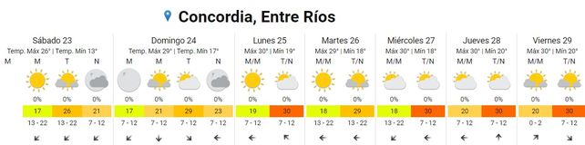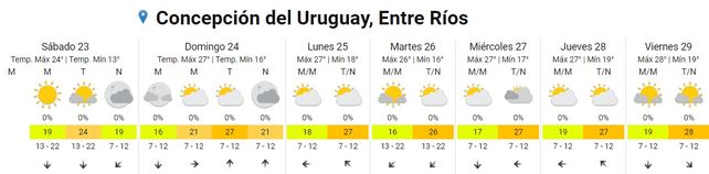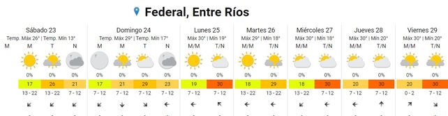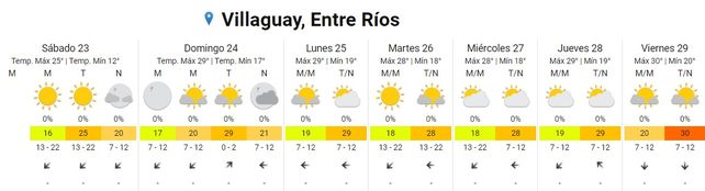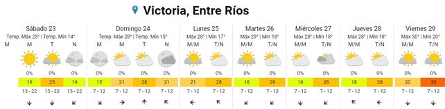 Para el viernes se espera que la temperatura máxima alcance los 30 grados con una mínima de 20, promedio. El cielo estará algo nublado durante toda la jornaday los vientos soplarán del norte.