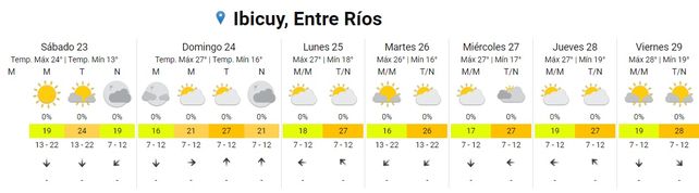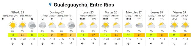El Servicio Meteorológico Nacional (SMN) prevé una semana de temperaturas otoñales. Habrá un paulatino ascenso de valores hacia el próximo fin de semana. Para este sábado el cielo estará despejado durante toda la jornada, las temperaturas promedio tendrán un mínima de 12 y una máxima de 25. El viento soplarará del norte.
