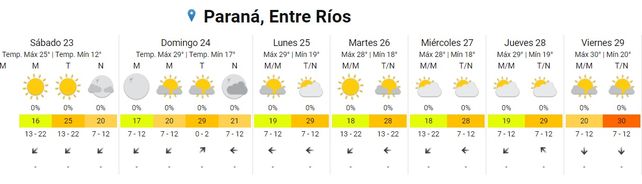 El domingo, las temperaturas se ubicarán entre los 17 y 29 grados, el cielo estará algo nublado durante toda la jornada, los vientos soplarán del noreste rotando al sudoeste.