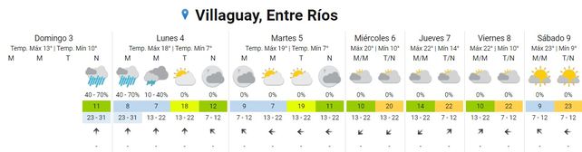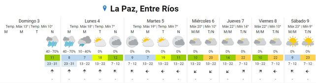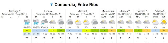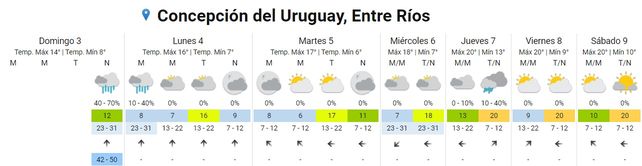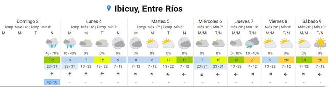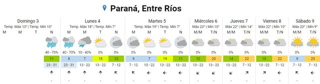 La semana que inicia está marcada por lluvias fuertes y temperaturas en paulatino aumento, según el pronóstico extendido del Servicio Meteorológico Nacional (SMN). El organismo prevé para lo que resta de este domingo probabilidad de entre 40 y 70% de lluvias fuertes y viento del sur. En tanto continúa el alerta por lluvias fuertes para el centro y norte de la provincia de Entre Ríos