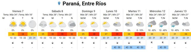 Para mañana sábado habrá un aumento de las temperaturas promedio que se ubicará entre los 25 y los 38 grados. El cielo estará parcialmente nublado durante toda la jornada y los vientos soplarán del norte rotando al noreste.