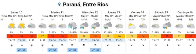 El miércoles habrá un leve descenso de temperatura con mínima de 20 y máxima de 31. Se esperan tormentas aisladas durante la mañana y la tarde. Los vientos soplarán del sudeste durante toda la jornada en el orden de los 42 a 50 kilómetros la hora.