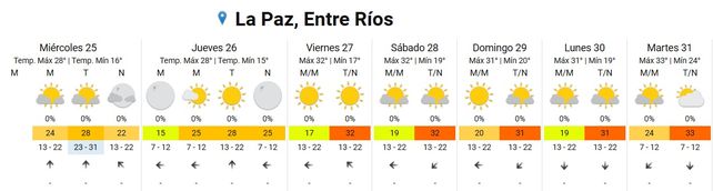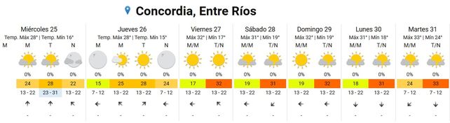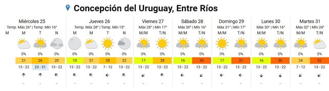El lunes en tanto las temperaturas se ubicarán entre los 19 y los 31 grados, el cielo estará algo nublado durante toda la jornada y los vientos soplarán del norte.