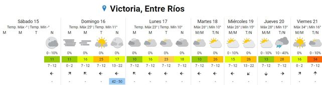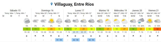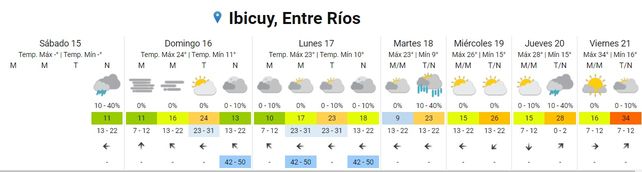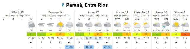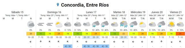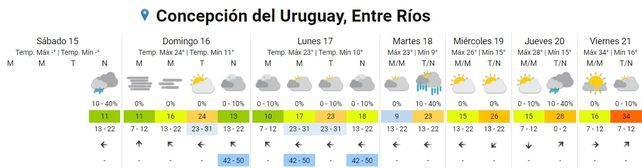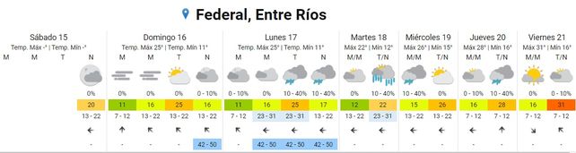 Para el martes estiman temperaturas de entre 11 y 25 grados. El cielo estará mayormente nublado por la mañana, parcialmente nublado por la tarde. La dirección predominante del viento será del este. En Federal, Concordia, Concepción del Uruguay, Gualeguaychú e Ibicuy se pronostican lluvias y tormentas.