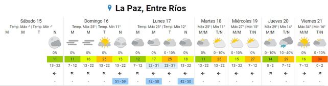 Para el viernes las temperaturas experimentará un aumento y se ubicarán entre los 16 y los 34 grados. El cielo está algo nublado por la mañana y mayormente nublado por la tarde. El viento soplará del oeste rotando al sudoeste.