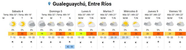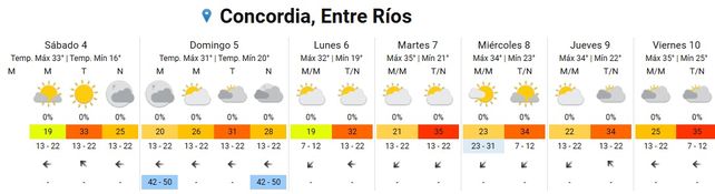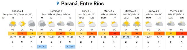 Para el domingo se esperan temperaturas promedio de entre 20 y 34 grados con cielos parcialmente nublados durante la mañana y mayormente nublado durante la tarde. Los vientos soplarán del sector norte rotando al este, entre los 42 y los 50 kilómetros por hora.