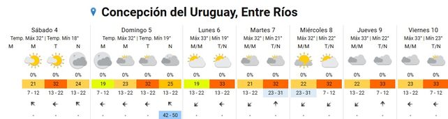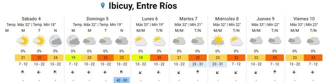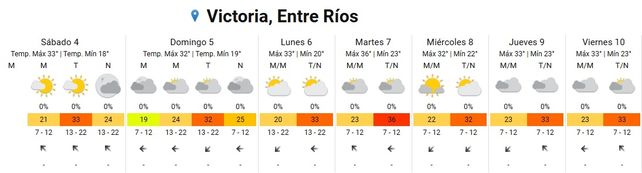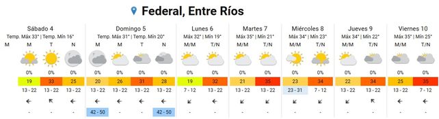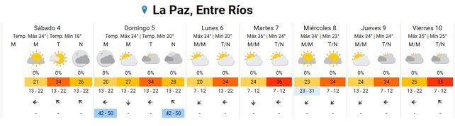 El viernes la temperatura subirá a 35 grados de máxima con una mínima de 25. El cielo estará mayormente nublado durante toda la jornada y los vientos soplarán del este rotando al sudeste.