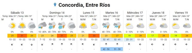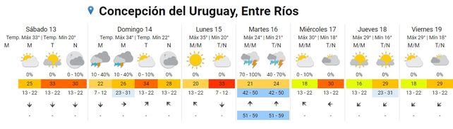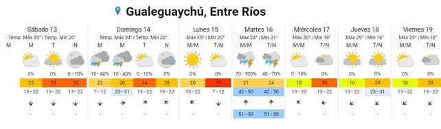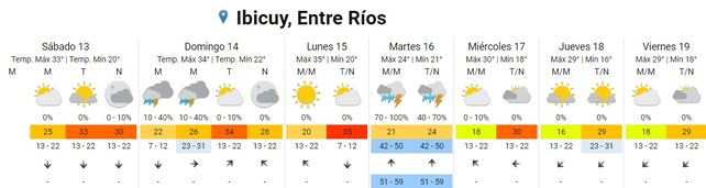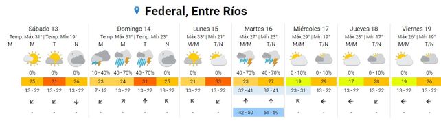 El Servicio Meteorológico Nacional (SMN) pronosticó dos días de tormentas para Entre Ríos en la semana que inicia el domingo e, inclusive incluyó a la provincia en un alerta amarilla por posibles fenómenos meteorológicos "con capacidad de daño y riesgo de interrupción momentánea de actividades cotidianas".