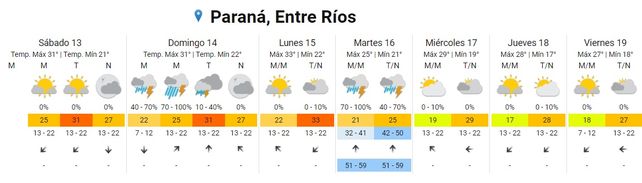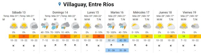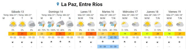 En el pronóstico extendido el SMN prevé para este sábado temperaturas promedio que irán desde los 21 grados centígrados de mínima a los 31 grados de máxima. El cielo estará algo nublado durante toda la jornada y parcialmente nublado por la noche. Los vientos soplarán del noreste rotando al norte.