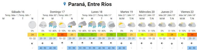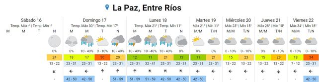 Para el viernes, en tanto, se esperan temperaturas promedio de 18 grados centígrados de mínima y 34 grados de máxima. El cielo estará mayormente nublado durante toda la jornada y el viento predominará del sector este.