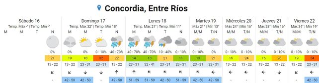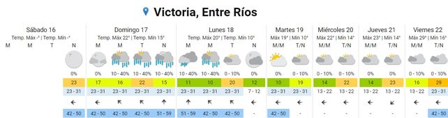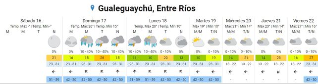 Para el lunes se espera un leve descenso de las temperaturas promedio con valores de entre los 11 y los 21 grados centígrados. Habrá tormentas aisladas por la madrugada, chaparrones por la mañana y por la tarde. El cielo se presentará parcialmente nublado por la noche. Los vientos soplarán del sur rotando al sudeste.