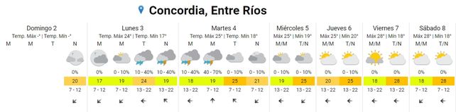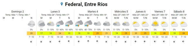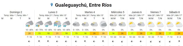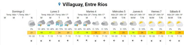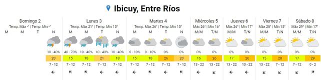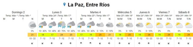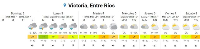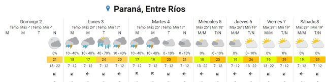 Para el martes se prevén tormentas aisladas durante la madrugada y la mañana, cielo nublado durante la tarde y mayormente nublado durante la noche. Las temperaturas marcarán 17, la mínima, y 25 grados, de máxima. Los vientos soplarán del sudeste rotando al noreste.