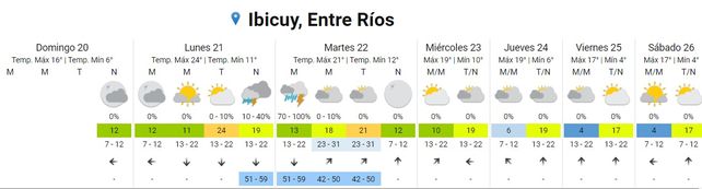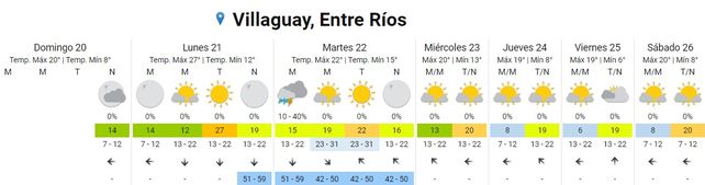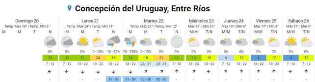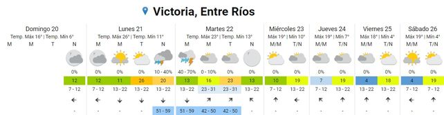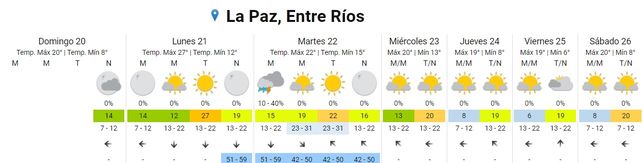 Para el martes se esperan temperaturas promedio entre los 15 grados de mínima y los 22 grados de máxima. Se pronosticaron tormentas aisladas a la madrugada, cielo algo nublado por la mañana y despejado por la tarde y la noche. En tanto, la dirección del viento predominará del noroeste rotando al sudeste con ráfaga de 60 kilómetros la hora.