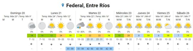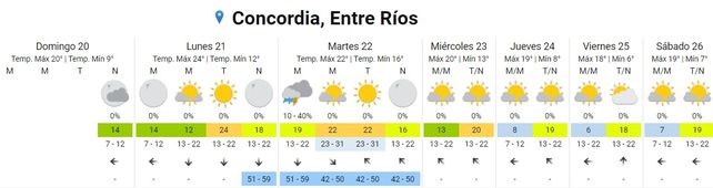Para el jueves, las temperatura promedio descenderán levemente con 8 grados de mínima y 19 grados de máxima. El cielo estará algo nublado durante toda la jornada y los vientos soplarán del este rotando al sudeste.