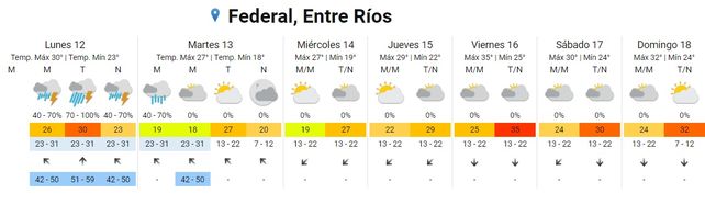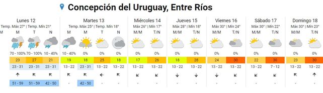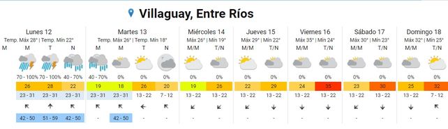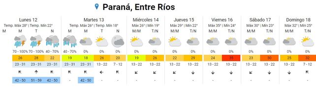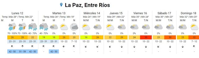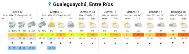 Este lunes 12, feriado de carnaval se pronosticaron tormentas fuertes durante la mañana y la tarde y chaparrones durante la noche, las temperaturas promedio estarán en el orden de los entre 22 grados centígrados de mínima y 28 de máxima. El viento soplará del sur trayendo alivio y rotará hacia el sector sudeste.