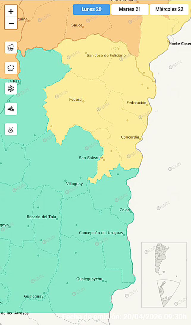 El Servicio Meteorológico Nacional (SMN) emitió un alerta amarillo por tormentas para el norte de la provincia de Entre Ríos. Los departamentos afectados son San José de Feliciano, Federación, Federal, Concordia y San Salvador.