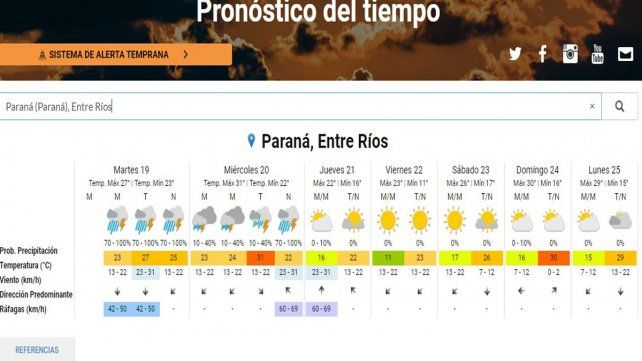 El SMN especificó que para hoy y hasta el jueves, se "esperan fenómenos meteorológicos peligrosos para la sociedad, la vida, los bienes y el medio ambiente". En Paraná, la probabilidad de lluvias y tormentas es de un 70%. La temperatura mínima, en tanto es de 23° y la máxima de 27°.