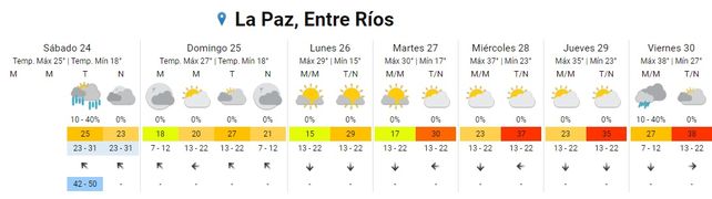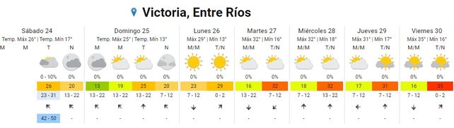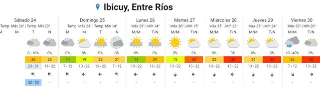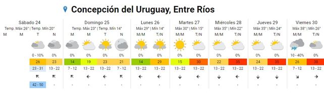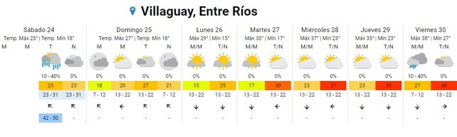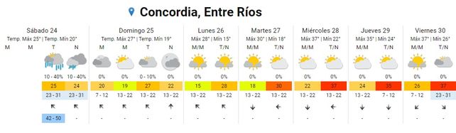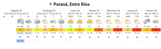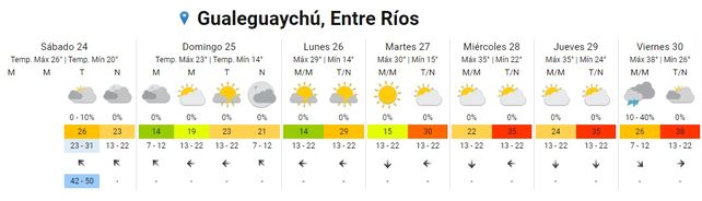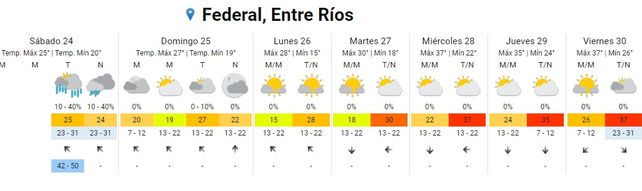 El Servicio Meteorológico Nacional (SMN) indica, para la semana que inicia, un aumento paulatino de las temperaturas promedios y la vuelta del calor en todo el territorio entrerriano, tras un breve respiro. El sábado inició con chaparrones en algunos puntos de la provincia pero el clima mejoró conforme avanzó la jornada con cielos despejados hacia la tarde y la noche. Las temperaturas resultaron un alivio (con 18 de mínima y 25 de máxima 25) aunque, promediando la semana aumentarán a más de 30 grados hasta alcanzar una máxima promedio de 38 grados. En tanto no se registran alertas para la provincia.
