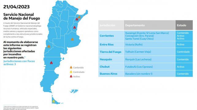 Según el organismo dependiente del Ministerio de Ambiente y Desarrollo Sostenible, las ciudades afectadas con incendios forestales activos son Victoria (Rufín), en Entre Ríos; Concepción (Estero Paraná) y Santo Tomé (Cuay Chico), en Corrientes; ; y Futaleufú (Los Cipreses), en Chubut.