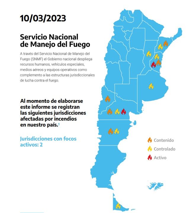 En tanto, las llamas se encuentran contenidas también en Ituzaingó, Concepción y San Miguel, en Corrientes; en Picunches, en Neuquén; y en Tehuelches y Cushamen (El Pedregoso), en Chubut.