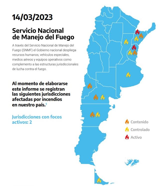 En su informe diario el Servicio Nacional de Manejo del Fuego (SNMF) reportó que se detectó un foco activo de incendio en el departamento Gualeguaychú (Don Elías), Entre Ríos. La misma repartición informó que se registra otros foco activo en las localidades de Ituzaingó (Punta Ñaro) y en Santo Tomé (Playadito), en la provincia de Corrientes.