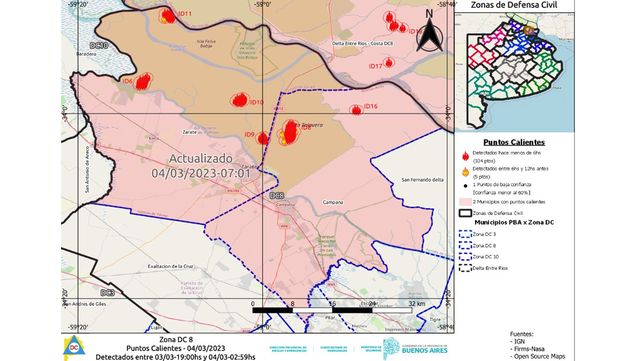 En Gualeguay continuaba activo los focos en El Bronce y Destacado 1; se había controlado el fuego en El Dorado y Sin Moneda y estaba contenido en Ibicuy (Brazo Chico e Isla Aeroclub).