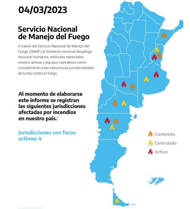 Las provincias de Entre Ríos, Buenos Aires, La Pampa y Chubut presentan hoy focos de incendios forestales activos, informó el Servicio Nacional de Manejo del Fuego (SNMF), dependiente del Ministerio de Ambiente y Desarrollo Sostenible.
