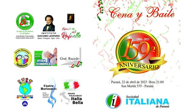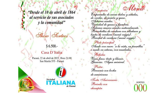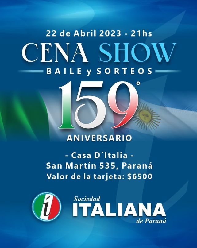 La Sociedad Italiana de Socorros Mutuos Cultural y Recreativa de Paraná realizará su cena aniversario el próximo sábado 22 de abril, a partir de las 21, en la sede de la Institución ubicada en San Martín 535 de la ciudad de Paraná. La tarjeta de la cena tiene un costo de $6.500 y el menú incluye una recepción, plato principal, postre, bebidas, torta aniversario y brindis. En la velada habrá diferentes shows y sorteos entre los presentes. Se puede reservar y adquirir en la administración de la institución en el horario de 7 a 14.