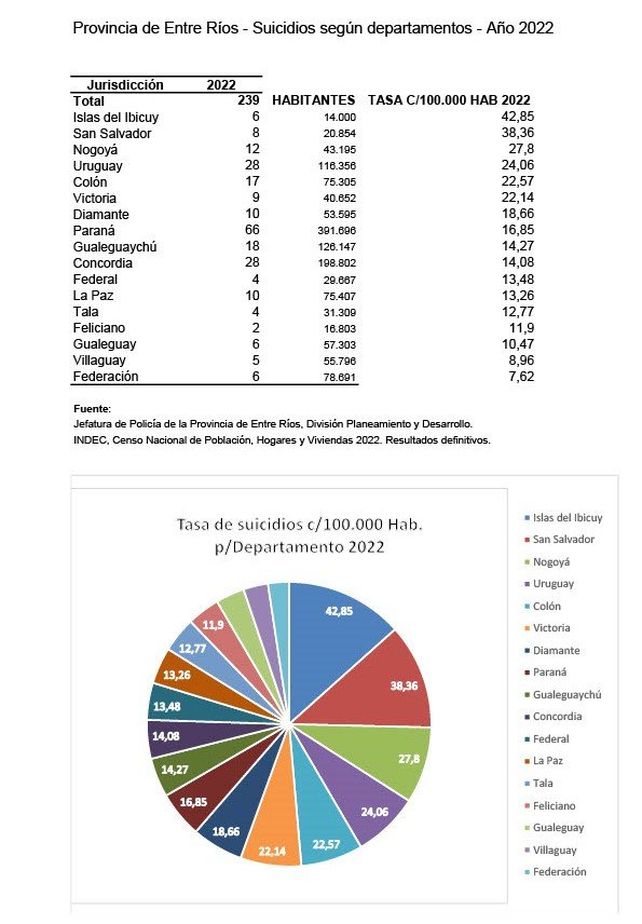 El pedido se sustenta al considerar que Entre Ríos sigue siendo, por segundo año consecutivo la provincia con más casos de suicidio en el país, por cada 100.000 habitantes mayores de 5 años, según los últimos informes del Ministerio de Seguridad de la Nación. El último documento oficial fue emitido en septiembre de 2023 y señala que la tasa provincial es de 18,4 (239 personas) y en 2022 el Departamento Paraná tuvo 66 muertes autodeterminadas, seguidas por Uruguay y Concordia (28 cada uno).