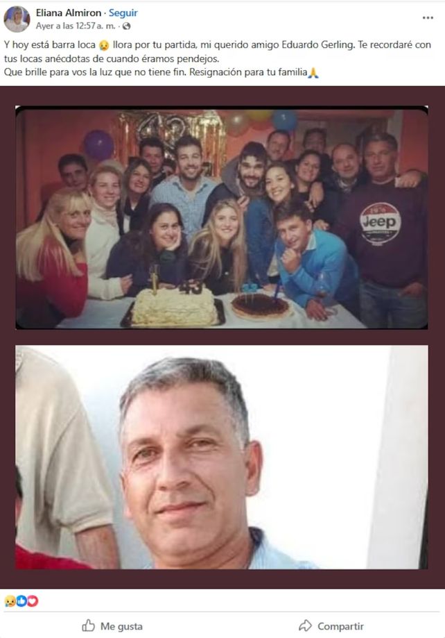Tras conocerse su muerte, amigos, vecinos y familiares inundaron las redes sociales con mensajes de despedida. "Hoy es un día difícil, demasiado especial, cargado de emociones y de pérdidas, de reencuentros que no van a ser. Qué tristeza me causa perderte, Eduardito querido… qué dolor. En paz descanses, que acá seguimos celebrando tu vida, a tu manera, impecable... como un rey", escribió una de sus amigas en una publicación acompañada por varias fotos juntos.